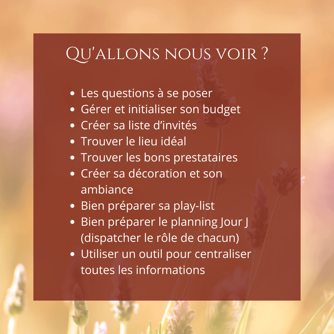 This workshop gives you all the keys and tips for organizing your “D-DAY”.